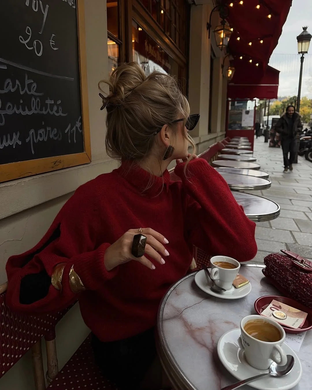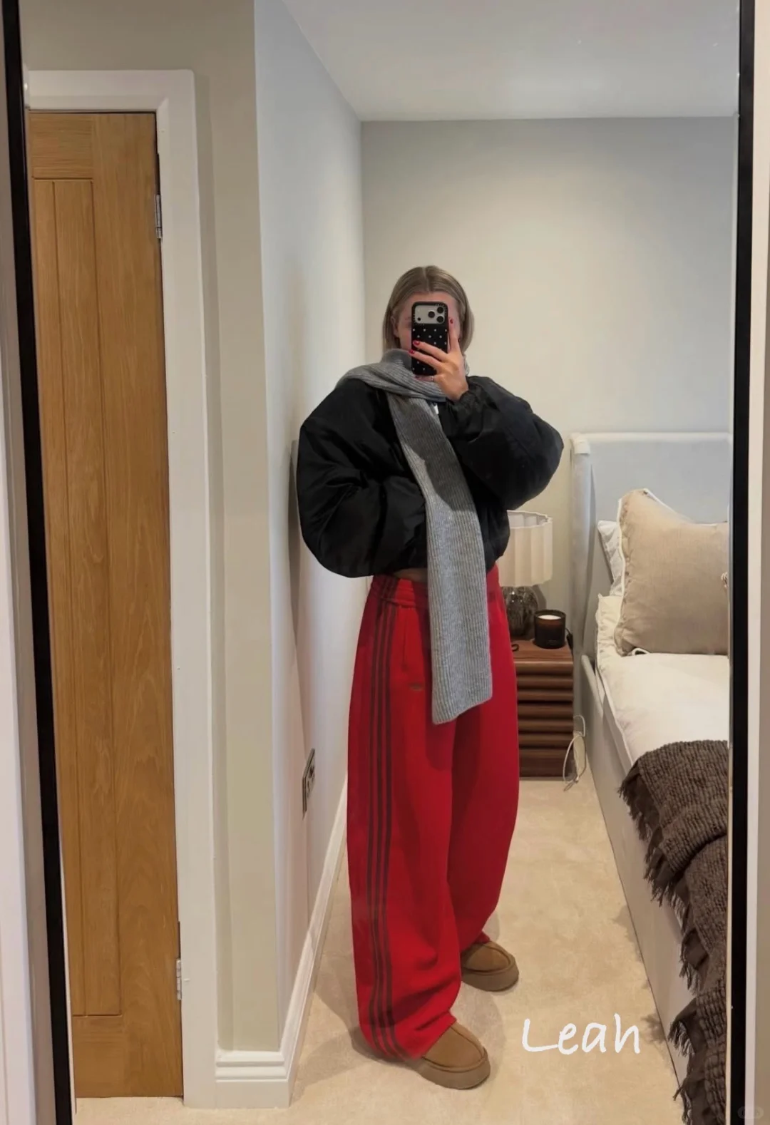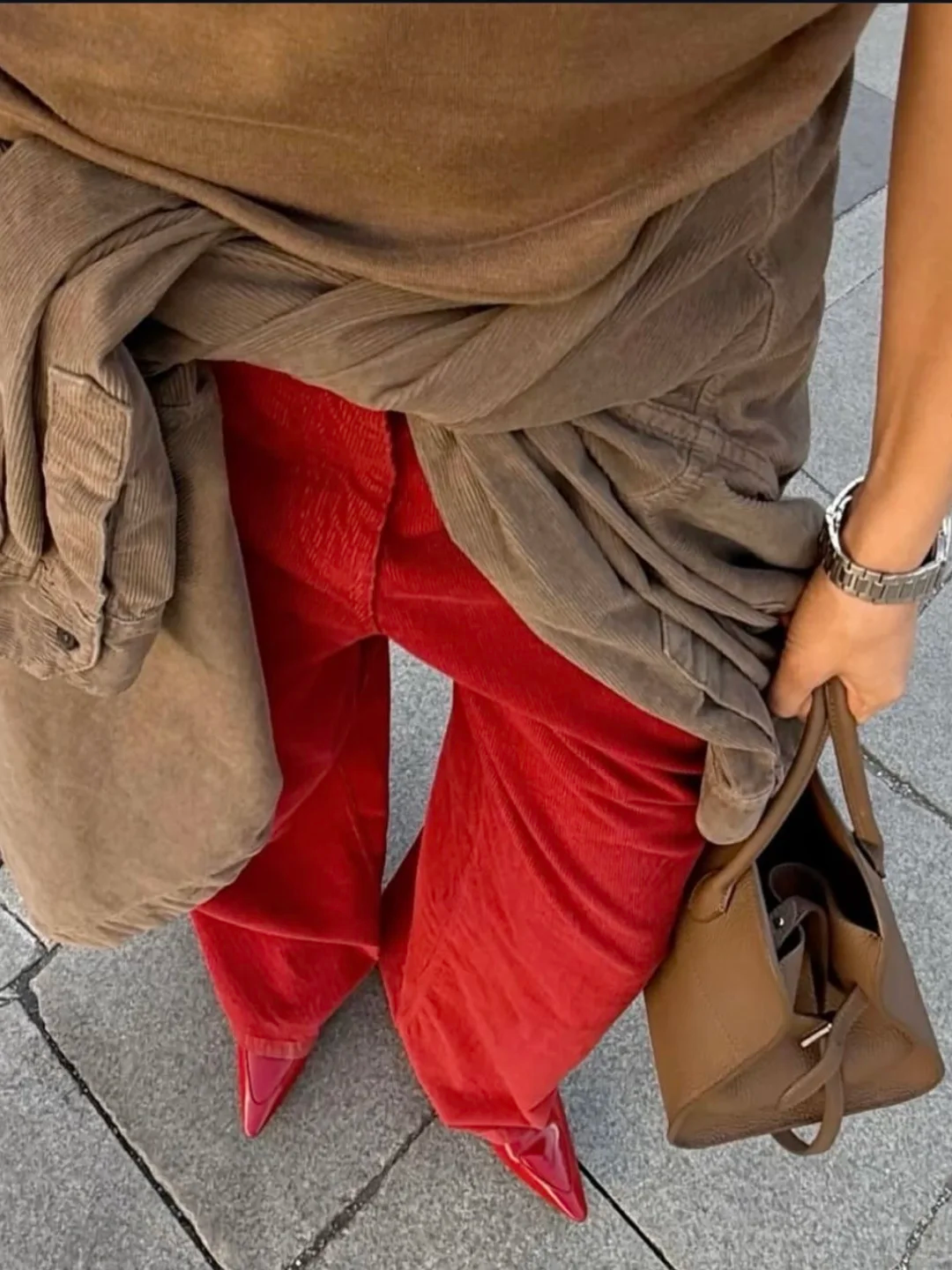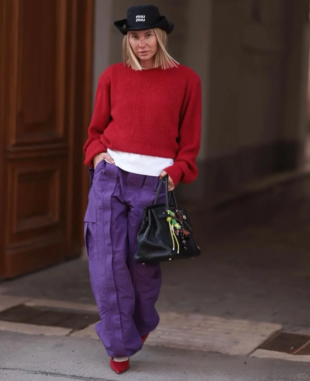 用修身或合身的上衣中和阔腿裤的宽松感,再用中性色(黑、白、驼、燕麦)压稳红色的视觉张力,轻松拿捏复古与利落的平衡。