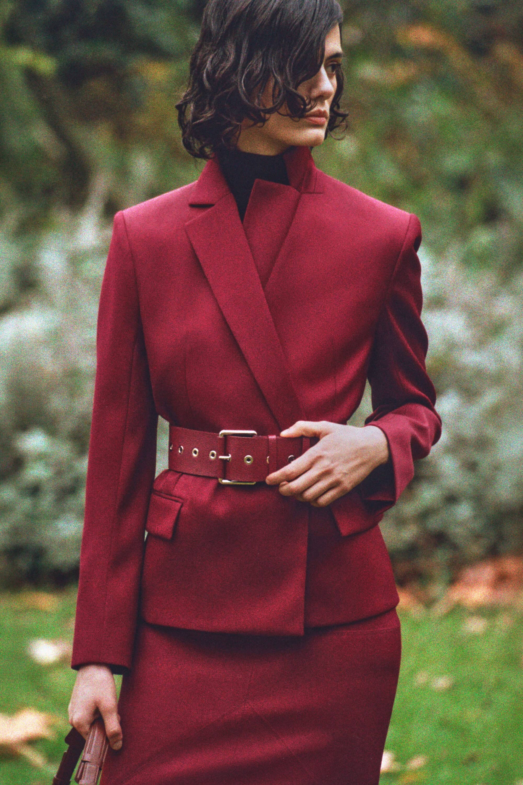这种 “复古 + 先锋” 的碰撞,让西野红既适合用于大衣、西装等厚重单品,也能成为针织、半裙等轻盈材质的点睛之笔.当它落在羊毛大衣上,是温暖而有分量的安全感;当它织进针织裙里,是柔而不弱的女性力量;当它点缀在配饰上,是不经意间流露的精致感。