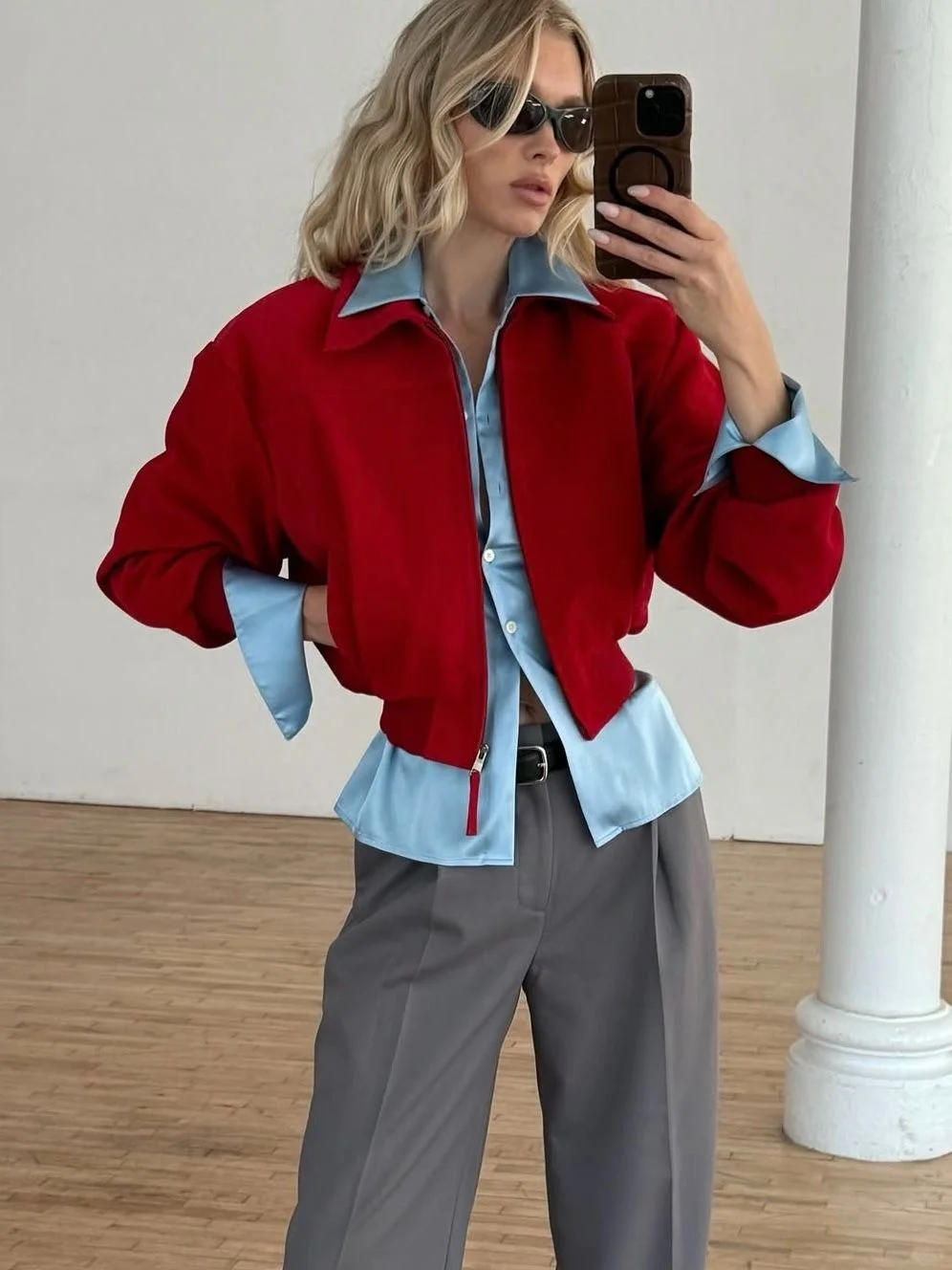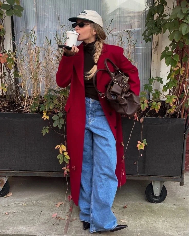 内搭同色系上衣 + 阔腿牛仔裤,红与蓝的碰撞复古又鲜活,黑包黑靴则平衡了红色的张扬,通勤时利落飒爽,逛街时又自带氛围感。