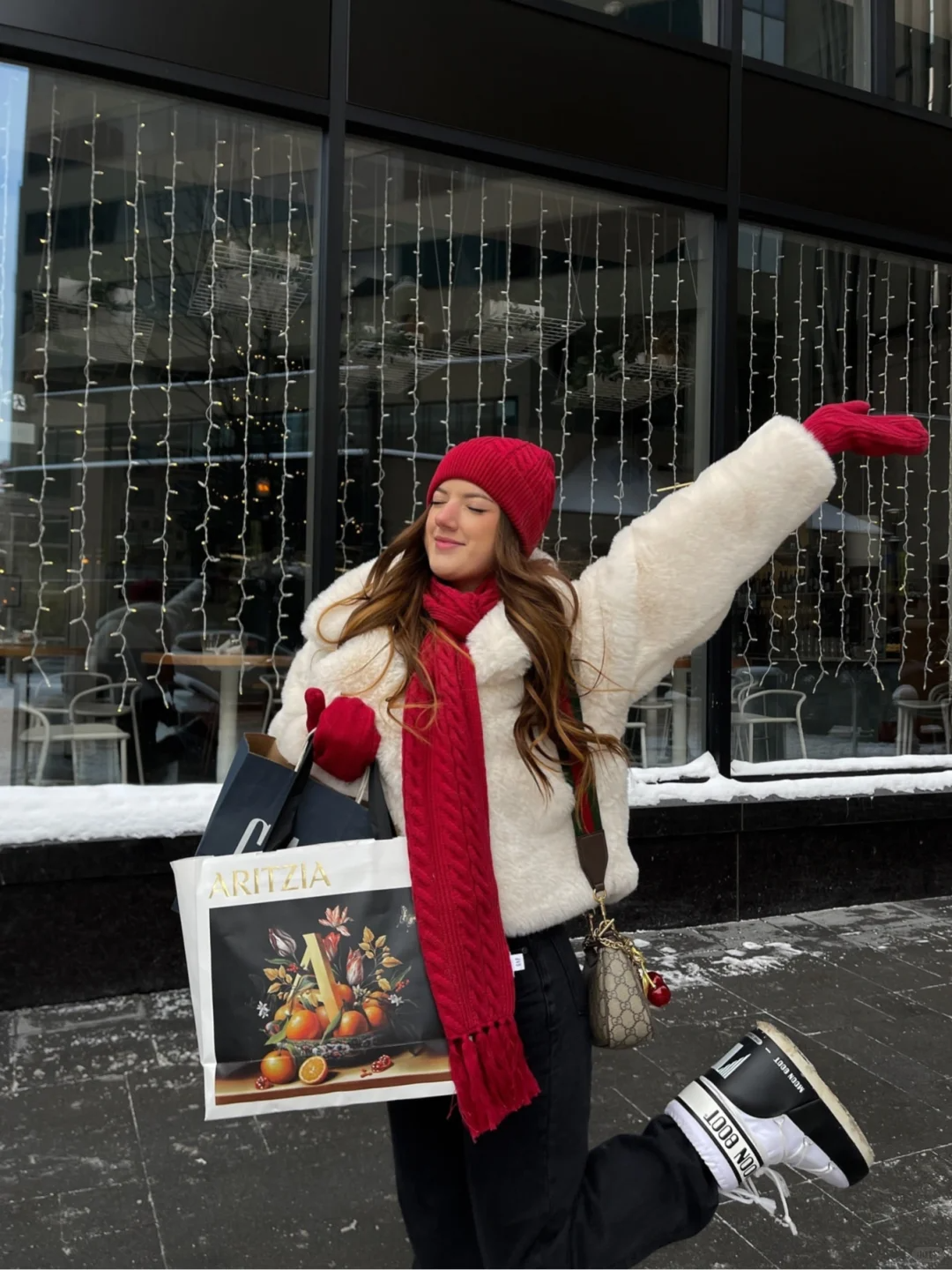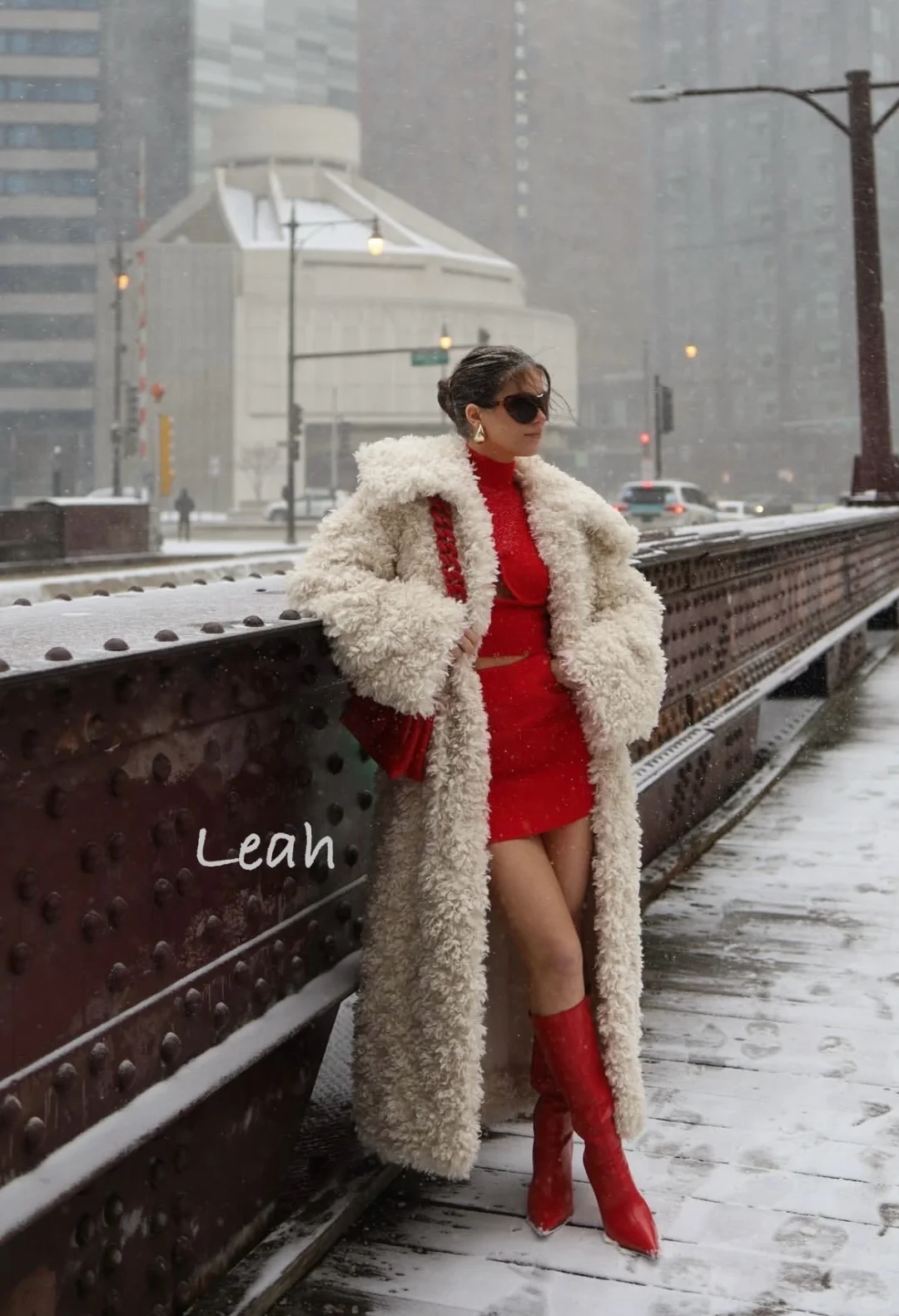 选择红色毛衣裙,毛绒的蓬松感中和了短裙的利落,甜酷平衡得恰到好处。