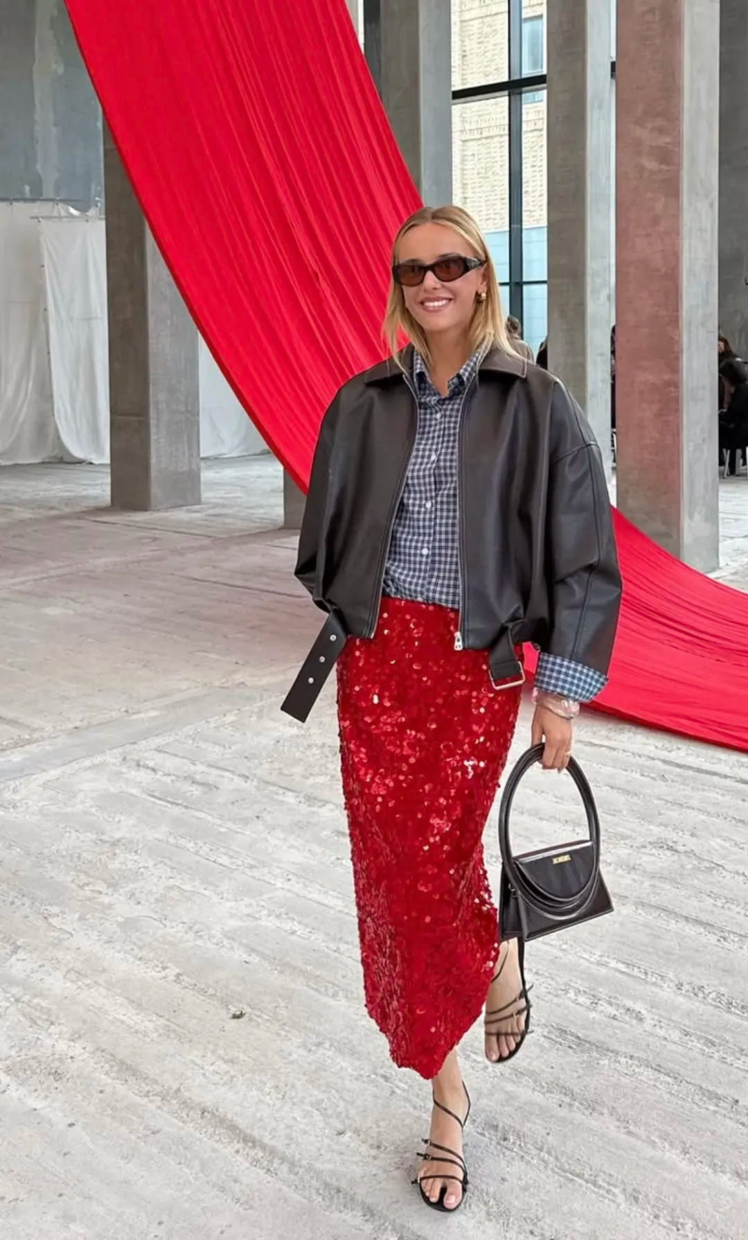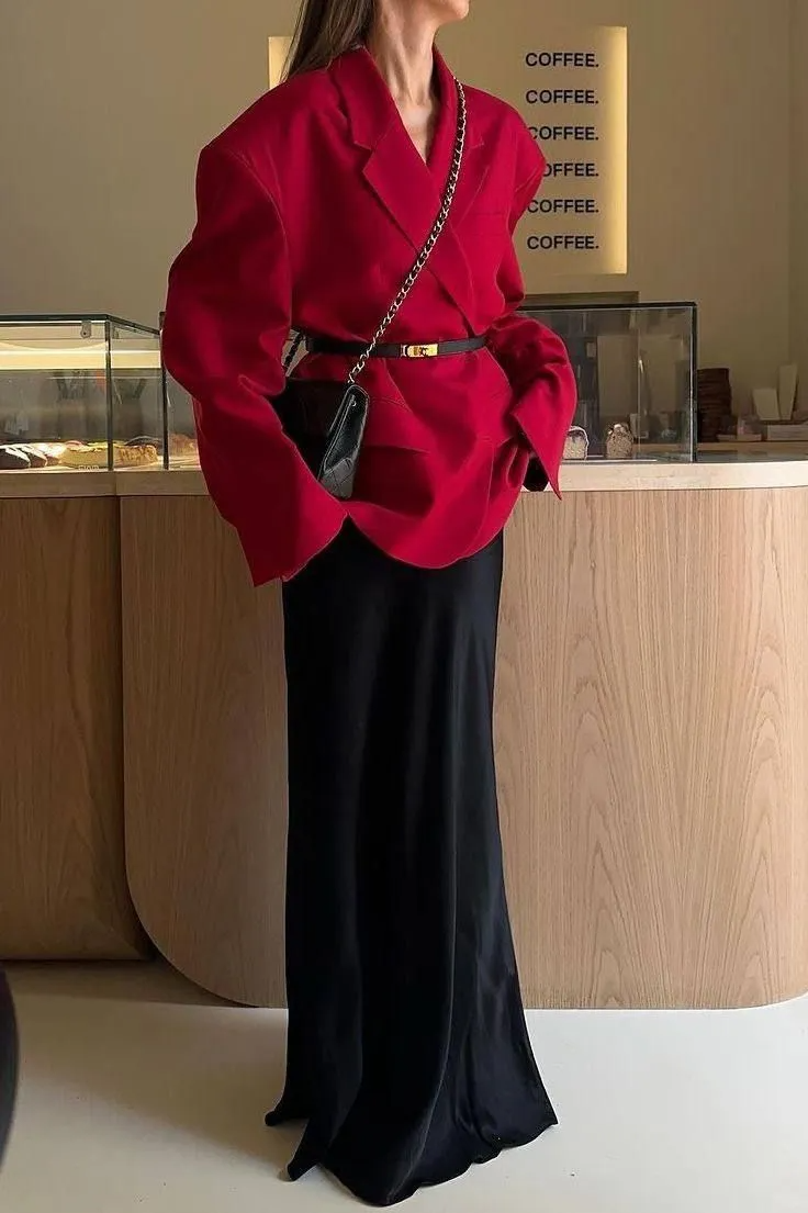 西装的宽松廓形自带慵懒松弛感,红棕底色与浅蓝牛仔的碰撞,是复古与街头的对话;西装的红色暖调与黑色长裙的冷调形成视觉对冲,高级感拉满。