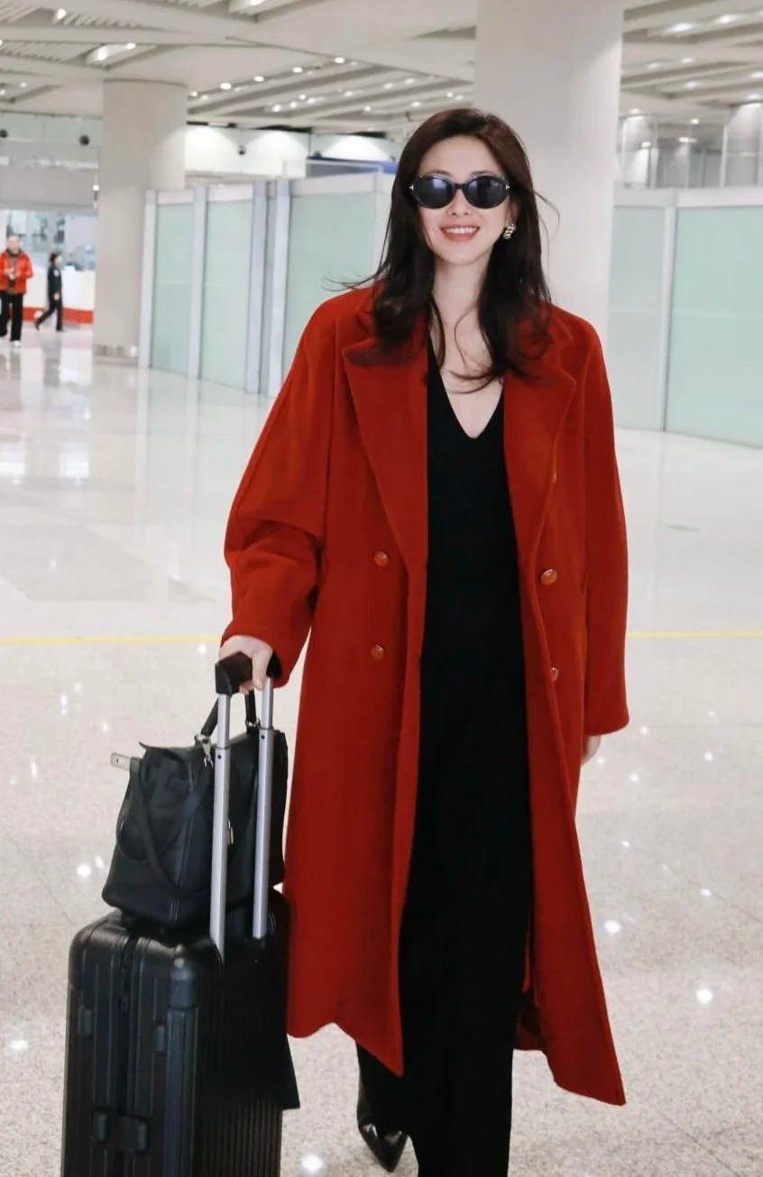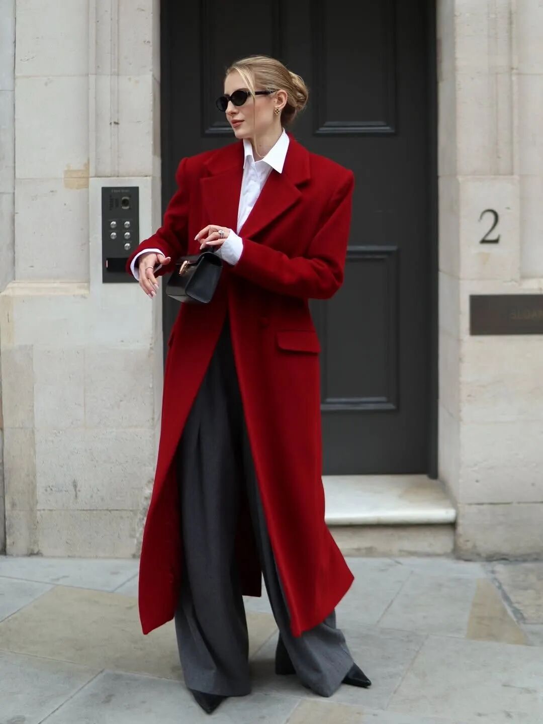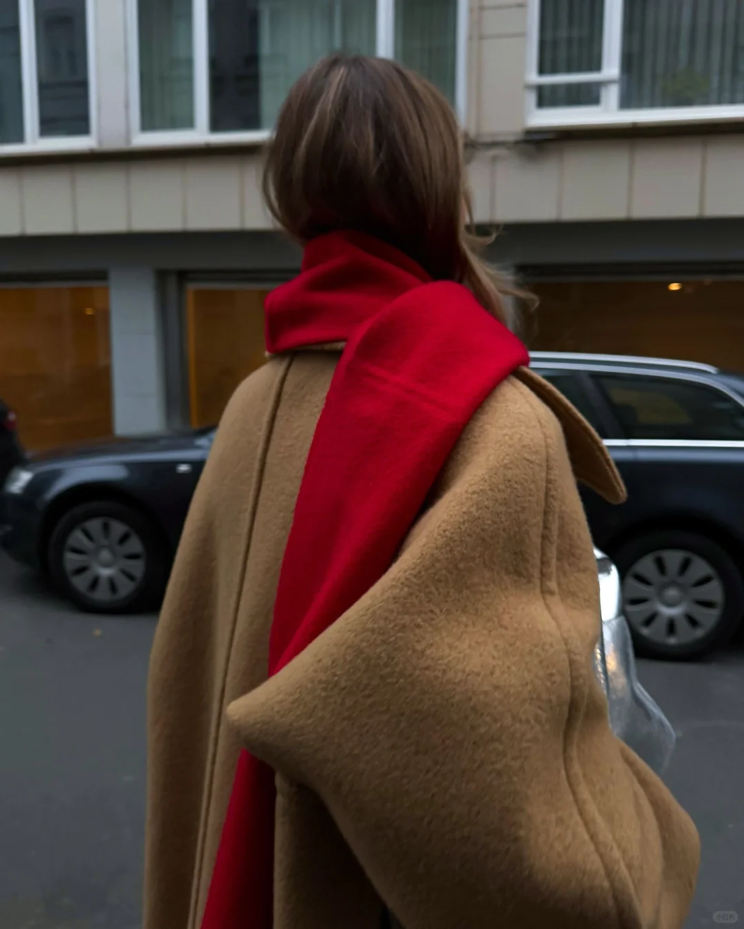 或用配饰(红围巾、红包包)小面积点缀,比如红色包包,既呼应了大衣的西野红,又不会让整体造型过载。