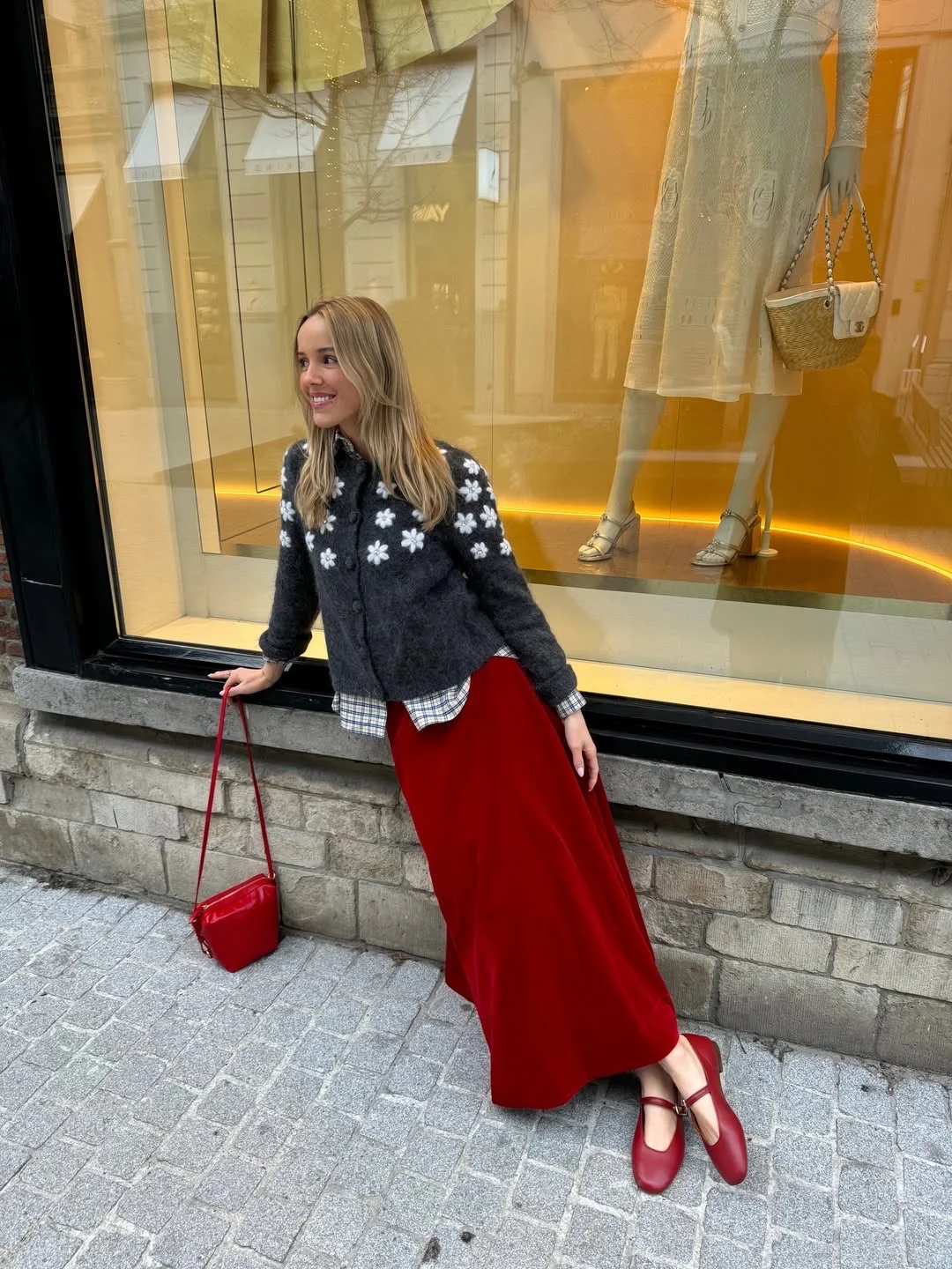 西野红毛衣的妙处,在于可盐可甜,可内搭可外穿, 单穿时是吸睛的视觉焦点,叠穿时是点睛的暖调底色,无论是搭配裙装还是裤装,都能拿捏住复古与活力的平衡。