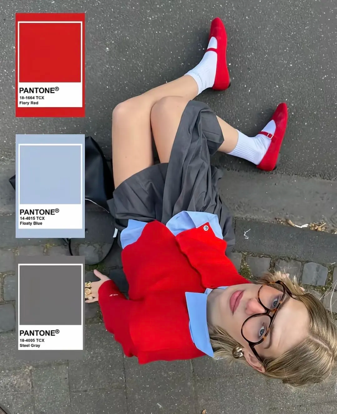 西野红 + 冷色调的碰撞,是复古与先锋的对话。比如西野红针织衫和大衣 + 蓝牛仔裤 ,红的暖与蓝的冷形成视觉冲击,适合追求个性的年轻群体。可以加入中性色来调和一下,比如蓝+红+灰组合。