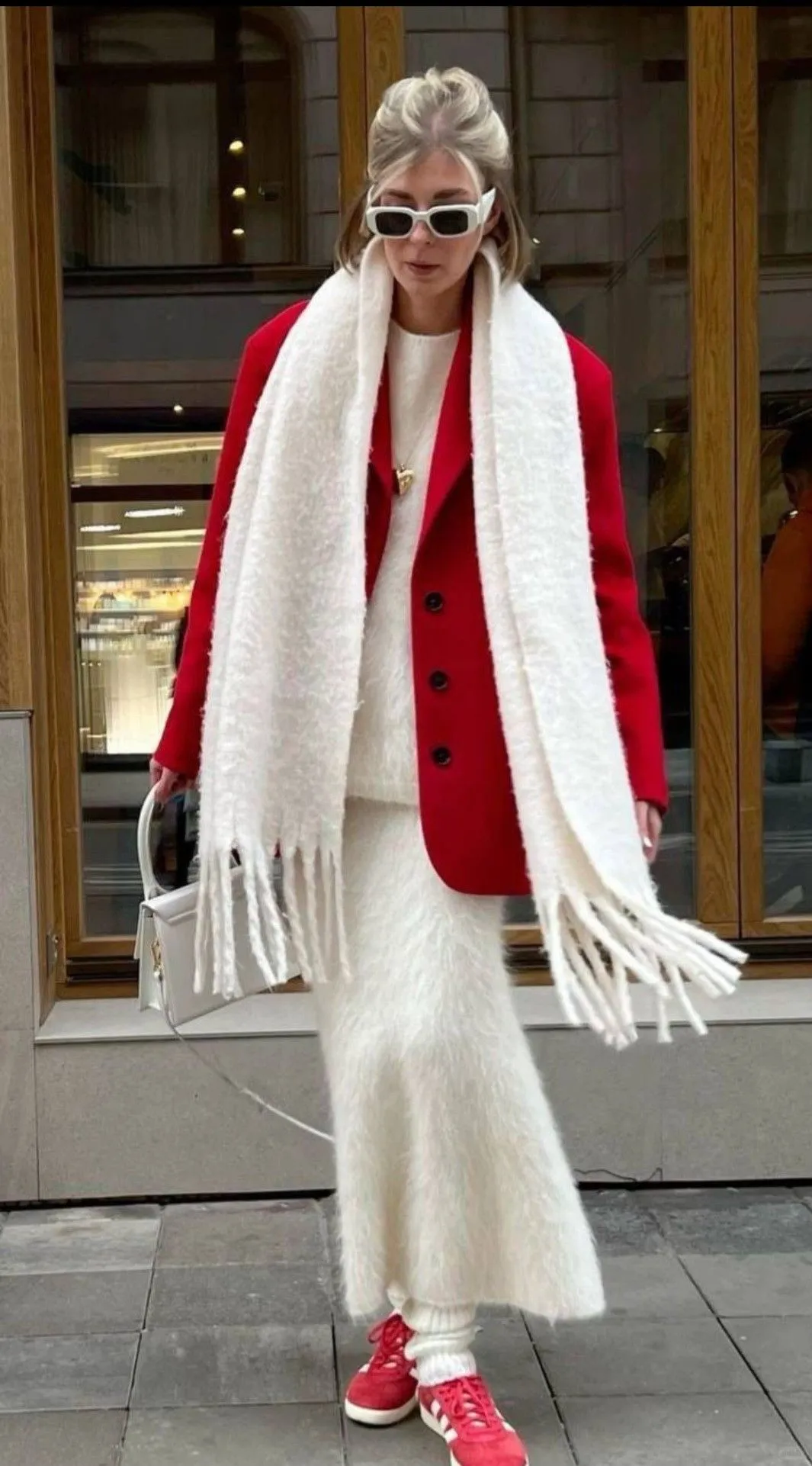 大面积红容易显臃肿,可用中性色单品(如白裤、黑裙)分割视觉。