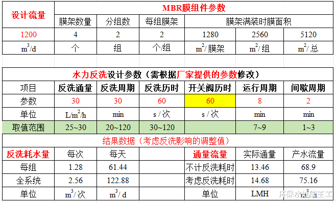 反洗(泵)流量根据同时反洗的总膜面积以及膜通量计算得出,再通过反洗周期和反洗历时计算出每日反洗需要的水量(反洗耗水量)。