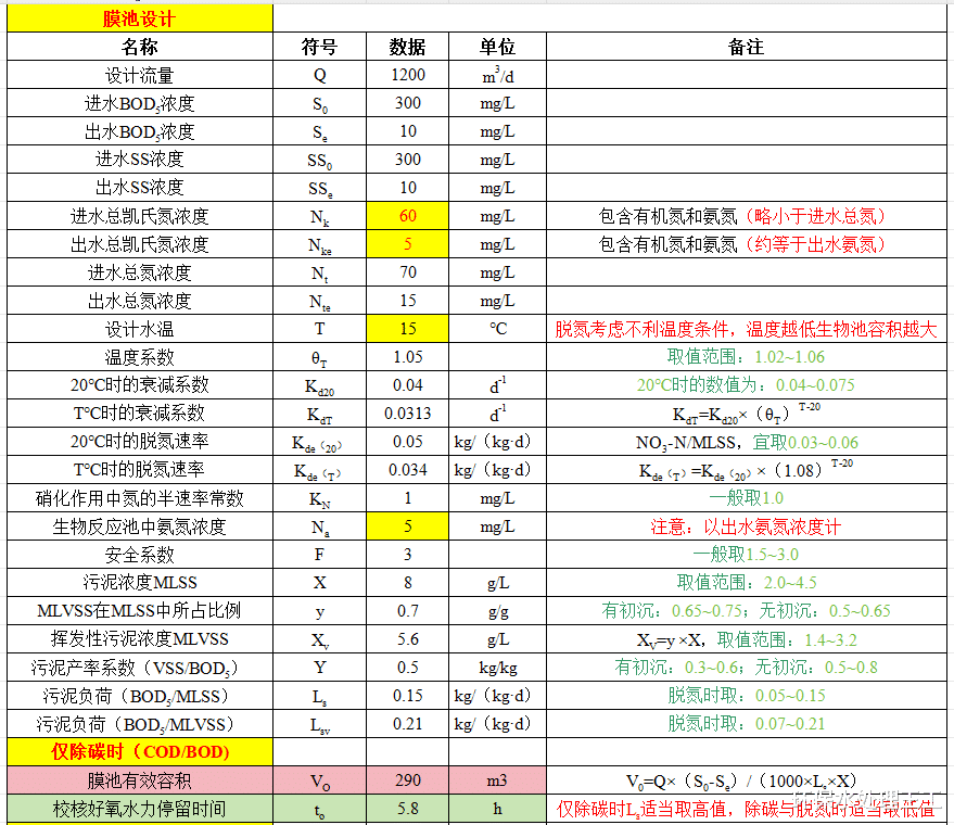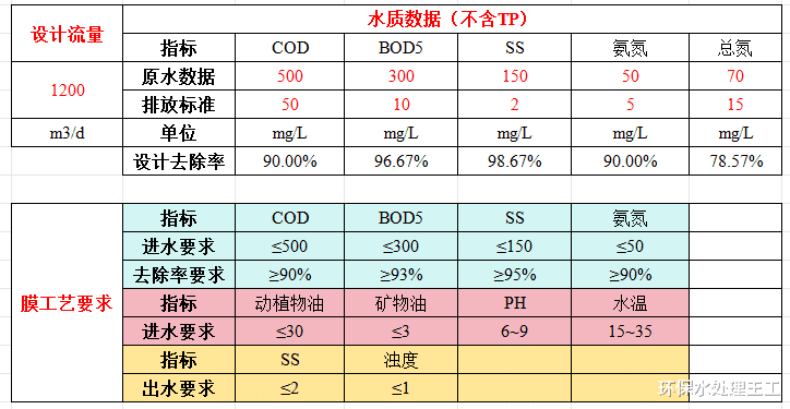 MBR膜工艺对系统的进水水质有比较严格的要求,计算表将规范中的数据整理了在一起,便于对比。若你的项目水质数据超出要求,则进入膜池之前需要进行预处理。