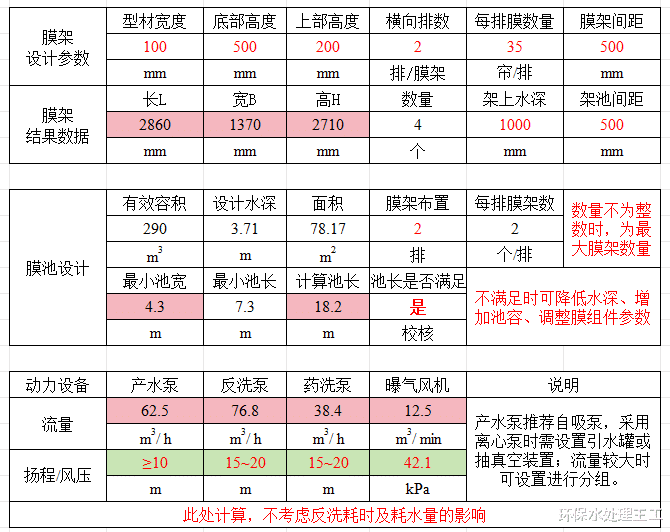 输入原始参数后,即可得到膜组件的设计结果数据,对于膜池的数据本表直接引用膜池计算表的结果,当然你也可以单独设置。