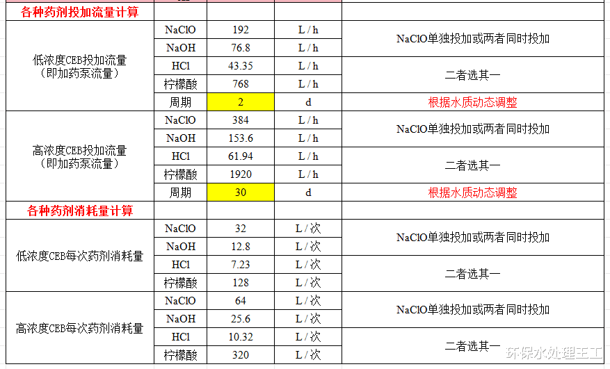 注入膜组件的药液量,以2L/m2计算,同时额外增加25%管路填充余量,得出的数据是每次CEB需要的投加到膜组件中的总药液量,这些药液需要通过5次向膜组件注入,每次注入后需要短时间浸泡(可设8min)。