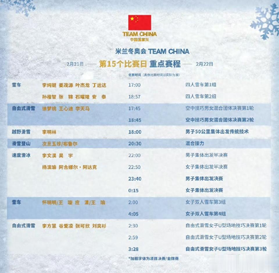 从傍晚开始,自由式滑雪相关决赛率先拉开金牌争夺序幕,随后越野滑雪、滑雪登山、冬季两项等项目也将陆续产生冠军。进入深夜和凌晨,速度滑冰男女集体出发、冰壶男子金牌赛、自由式滑雪女子U型场地技巧决赛等重头戏接连上演。