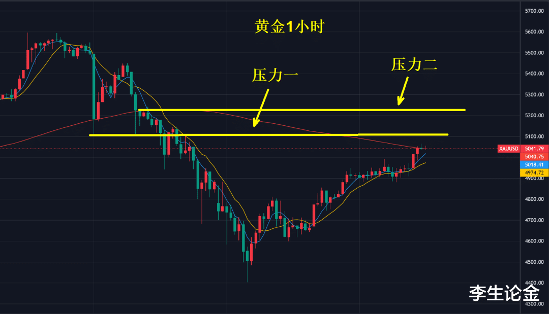 目前,黄金向上反弹图中两个位置重点关注,一个是上周四金价暴跌后首次支撑5100美元,这里将有大量套牢盘,其次才是压力二位置5100美元当时反弹压力点。此区域属于密集交投区,被套者选择在这里解套离场。