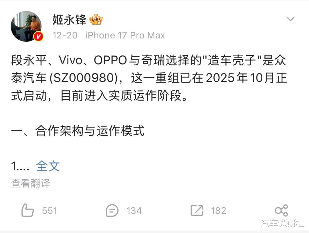 从本月中旬开始,关于OPPO、vivo联合奇瑞,借壳众泰入局造车的传闻震动业界。12月20日,财经博主@姬永峰发布微博称,段永平、vivo、OPPO与奇瑞选择的“造车壳子”是众泰汽车,这一重组已在2025年10月正式启动,目前进入实质运作阶段。在这条微博中,他详细描述了合作架构以及未来可能的合作模式。