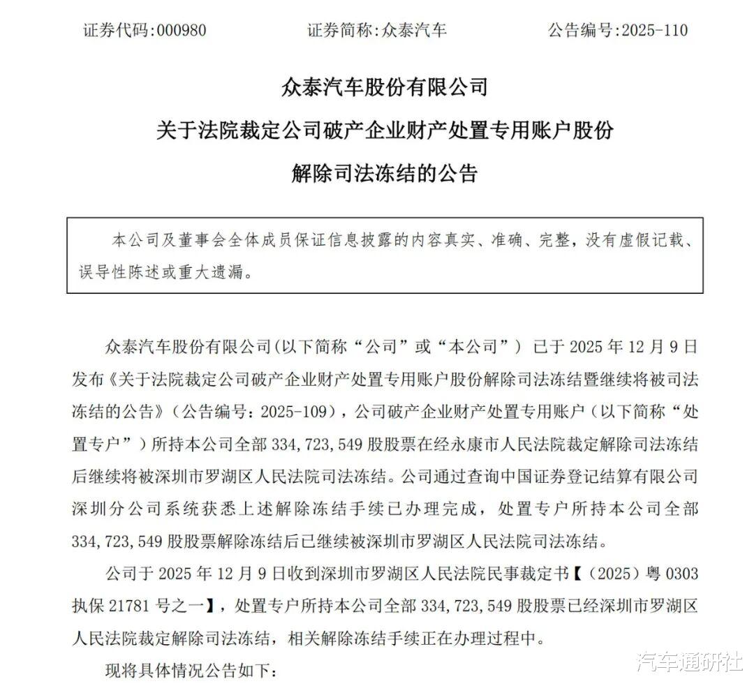 众泰汽车在12月8日、9日晚间连续发布两则公告,涉及解除司法冻结的股份,并计划处置部分股份用于整车复产。