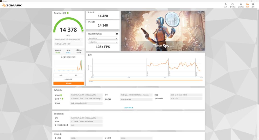 在3DMark Time Spy测试中,这台机器取得14420的显卡分数,这样的表现对比上一代RTX 4060笔记本电脑GPU来讲,这台机器搭载RTX 5070笔记本电脑GPU有大约33.2%的领先优势。