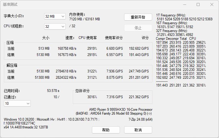 在7-Zip 24.08压缩/解压缩测试中,魔霸9 Mini取得221.362 GIPS的总分,这样的表现同样不俗,这再次印证“小机身、大能量”的本色。