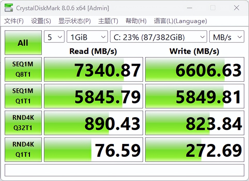 魔霸9 Mini还采用1TB PCIe 4.0 SSD,从CrystalDiskMark 8.0.6的测试结果来看,它的顺序读取速度为7340.87MB/s,顺序写入速度达到6606.63MB/s,这样的表现能够为用户带来更快的数据存储体验,无论是加载3A游戏还是处理超高清视频剪辑、3D渲染和大型项目文件,都有疾速表现。