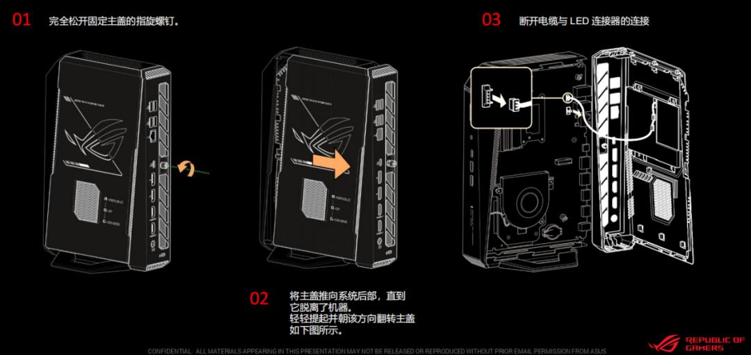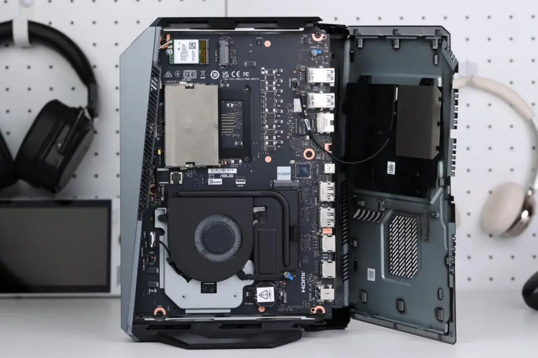 对于迷你PC来说,最让人头疼的往往是维护和升级。很多厂商为了压缩体积,把内部塞得满满当当,让拆机变得更困难。不过ROG魔霸9 Mini显然不想给玩家制造这种焦虑,它采用免工具拆卸设计,只需拧松背部的一颗螺丝,然后轻轻一推,侧面板就能滑出,这种设计让我想起了以前玩积木时的那种爽快感。