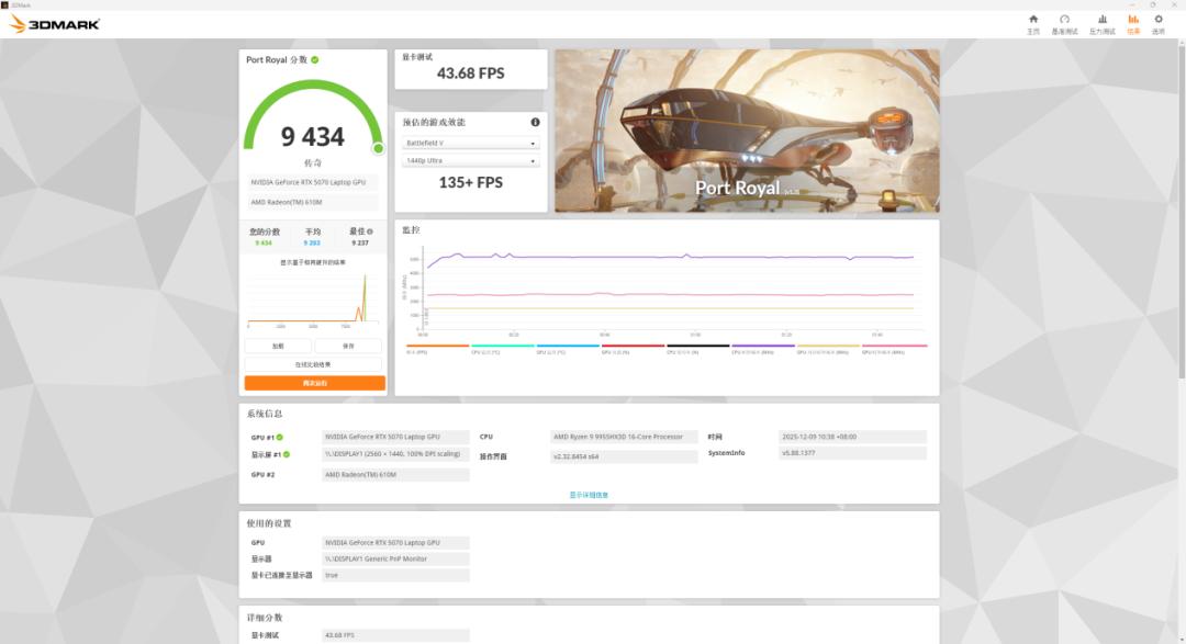 在3DMark Port Royal测试中,魔霸9 Mini取得9434的总分,领先RTX 4060游戏本大约57.8%。这表明新一代RTX 50系列笔记本电脑GPU不仅在图形性能上带来了极大的飞跃,在实时光线追踪的表现上相对前代GPU而言也有突出的优势,值得玩家升级。