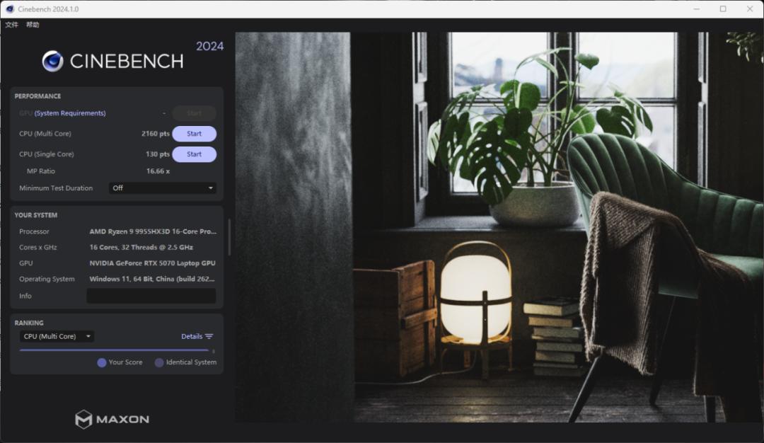在实际测试中,我们开启“增强模式”。在CINEBENCH 2024处理器渲染性能测试中,魔霸9 Mini得到130pts的单线程成绩和2160pts的多线程成绩。分开来看,在单线程方面,魔霸9 Mini的表现已经达到锐龙9 9955HX游戏本的水准,在多线程方面更是超越大多数锐龙9 9955HX游戏本(2020pts左右)。对于一台体积3L左右的迷你PC来讲,这样的表现可谓相当出色。