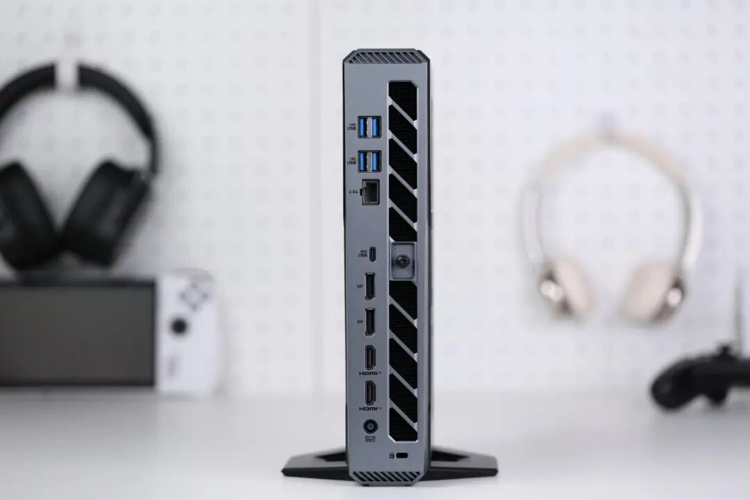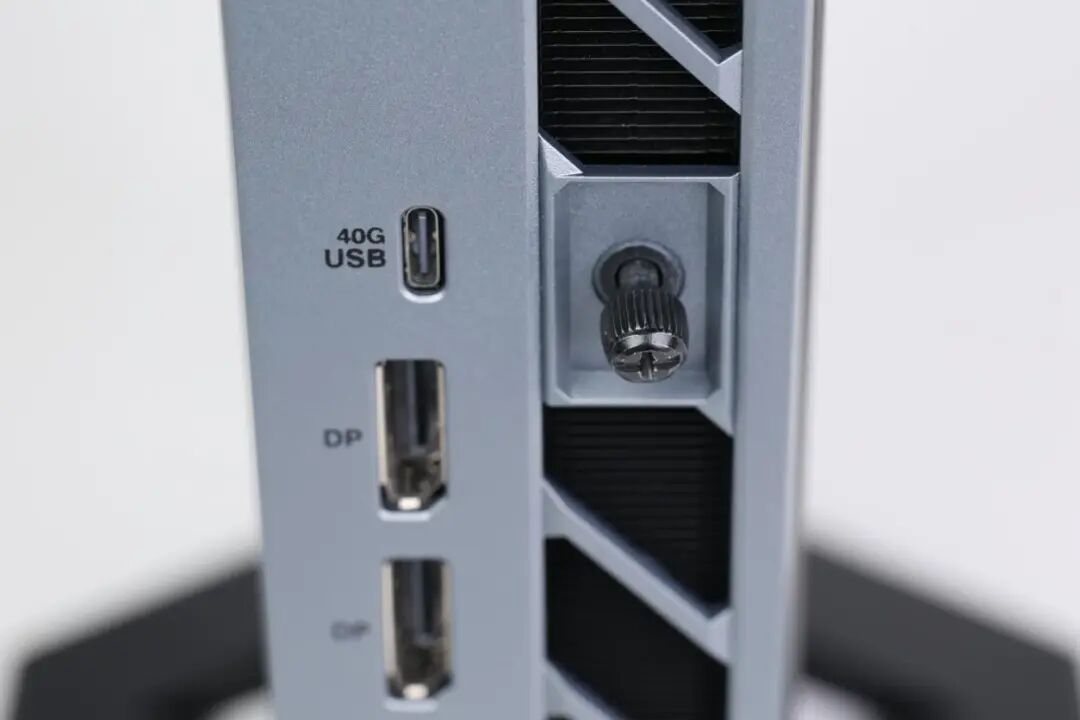 魔霸9 Mini的背部则提供了一系列显示接口和USB-A、USD-C等扩展接口,具体如下:USB-A 3.2 Gen2×4(10Gbps)、2.5G网线接口×1、USB4接口×1(连接集成显卡)、DP2.1×2、HDMI 2.1 FRL×2(上方的HDMI连接集成显卡)、电源接口×1。其中,拥有40Gbps传输速率的USB4接口不仅能以最高40G的速度传输数据,还能支持DP1.4一线连,以及5V 3A对外供电,甚至可以外接显卡坞(虽然自带的RTX 5070笔记本电脑GPU已经很强了)。