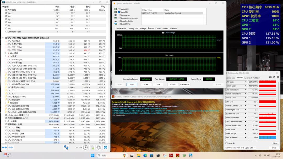 熟悉ROG产品的玩家估计都知道,ROG在《奥创中心》中保留了“手动模式”供极客玩家手动调整处理器和显卡的各项参数。我们在“手动模式”中将各项参数全部拉满,双烤刚开始时整机能够维持130W+115W(CPU+GPU)左右的性能释放水平,随着烤机时间的拉长,30分钟后可见这台机器能够维持127W+115W(CPU+GPU)的整体释放水平,高达242W的整体性能释放水平即便放在发烧友级别的游戏本上也是出类拔萃的表现。由此可见,魔霸9 Mini的性能确实强悍。