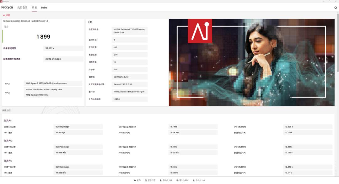 对于Stable Diffusion 1.5这样的文生图模型,魔霸9 Mini也能应对。在UL Procyon的Stable Diffusion 1.5(FP16)测试中,这台机器取得1899的总分,平均生成一张图需要3.29秒,这样的速度能够满足不少创作者的需求。