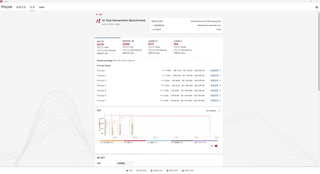 比如在UL Procyon的本地大模型基准测试中,这台机器本地运行13B的LLAMA 2模型的推理速度达到10.5 tokens/s,本地运行7B规模的MISTRAL模型,推理速度高达79.64 tokens/s。