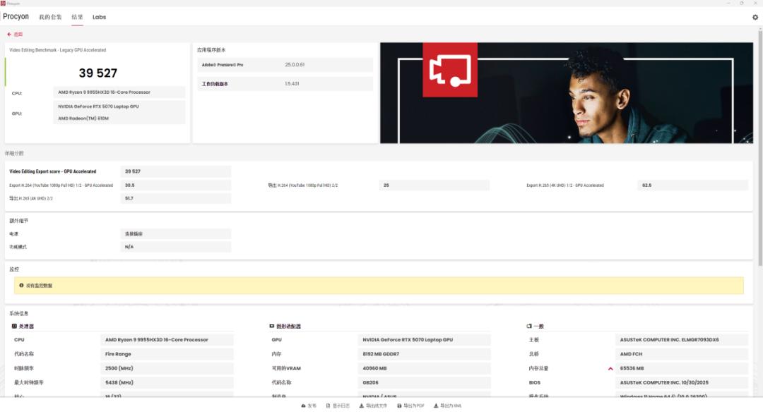 此外,魔霸9 Mini也能轻松应对创作类任务。比如在UL Procyon的视频编辑测试中,测试软件会调用安装在系统中的Premiere Pro来真实模拟用户剪辑视频的工作流。在这个测试中,魔霸9 Mini在开启GPU硬件加速的设置下取得39527的总分。这表明在RTX 5070笔记本电脑GPU的加成下,魔霸9 Mini能够高效地完成视频剪辑任务。