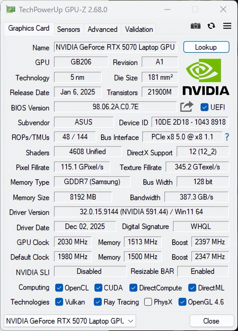 GPU:NVIDIA GeForce RTX 5070笔记本电脑GPU(8GB GDDR7、115W)