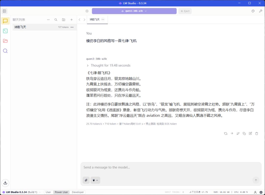我们还通过LM Studio在本地部署了几个大模型来实测。在采用Q4量化的Qwen3-30B-A3B大模型时,这台机器在LM Studio中的推理速度为25.7 tokens/s,这样的表现能满足日常使用的需求。
