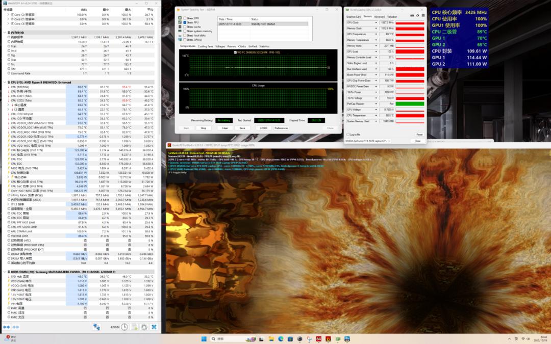 首先在“增强模式”下双烤30分钟,魔霸9 Mini的处理器能够维持110W左右的性能释放水平,GPU能够维持114.44W左右的性能释放水平,总体上整机能够维持225W的性能释放,对于一台迷你PC来讲这是相当强悍和出色的表现。