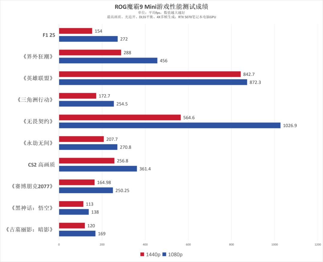 在1440p分辨率下,魔霸9 Mini也能轻松应对以上测试游戏。它在《黑神话:悟空》中的平均帧率达到113fps;在《赛博朋克2077》中的平均帧率达到164.98fps;在《无畏契约》和《三角洲行动》中的平均帧率分别达到564.6fps、172.7fps。