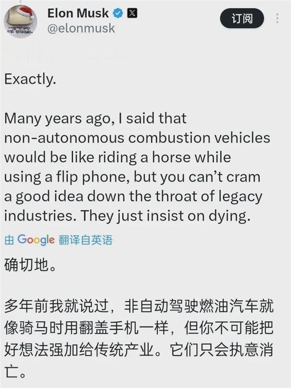 将时间回溯至本月中旬,特斯拉首席执行官马斯克在社交网络上回应网友关于美国汽车制造商电动化转型的评论时称,没有自动驾驶能力的燃油车就如同“骑着马用着翻盖手机”。