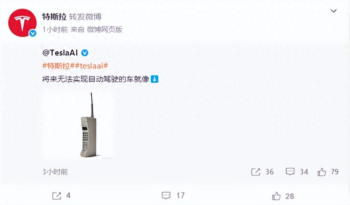快科技12月25日消息,今日,特斯拉官方账号发文表示:将来无法实现自动驾驶的汽车将像.....,配图则是一张早就淘汰并过时的“大哥大”。