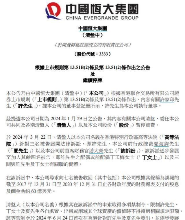 2026年1月最新进展显示,清盘人团队已正式向许家印、夏海钧(恒大前高管)等人追讨约60亿美元不当所得,这些资金多为二人通过虚假业绩分红、关联交易等方式侵占的公司资产。