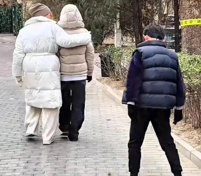 女儿小玥儿身高已近170cm,闷闷不乐地跟在父亲身旁。