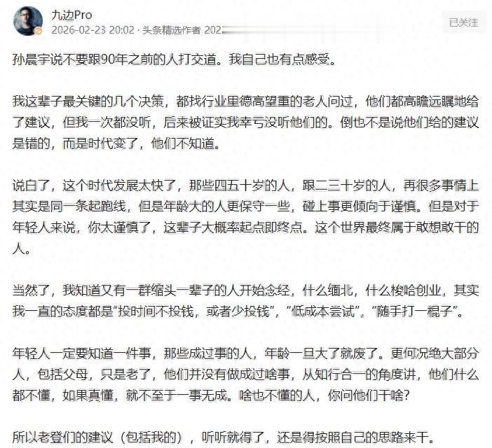 其实倒不是这些前辈害怕“长江后浪推前浪”,而是这个时代发生的变化,他们已经不知道了,他们给出的建议都是基于自己的想法和过去的经验,但现在的时代是互联网的时代,是知识大爆发的时代,甚至已经是人工智能的时代。一切知识体系被拆解和重构了,许多常用的工具都是新的,面对的复杂问题也是新的,在这些问题面前,年轻人和“老登”们已知条件和未知条件是一样的,甚至“小登”们没有固定思维束缚,反而更容易找到解决问题的答案。所以,“小登”们想像过去一样从“老登”那里找到现成的答案,想拿来就用,已经不可能了。你自己敢想,敢干,勇于尝试,反而更容易成功。