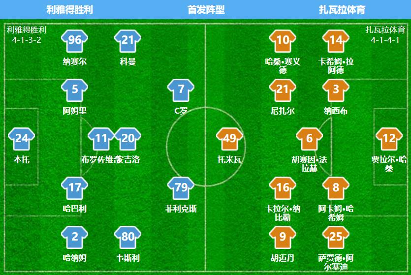 利雅得胜利vs扎瓦拉体育,利雅得胜利在亚冠精英联赛都是超级存在,踢个两级联赛完全是一边倒的比赛。热苏斯排出4132阵型,C罗和菲利克斯组成葡萄牙双锋,科曼左边锋,B罗坐镇后腰,球队首发身价9820万欧元;而对手扎瓦拉体育首发身价仅有385万欧元,不足利雅得胜利首发身价的1/25,两队差距很大,特别的大。即使实力如此悬殊的比赛,身为首发出战的超级球星C罗还是哑火了,赛后仅获得6.7分,为利雅得胜利首发11人的最低分。