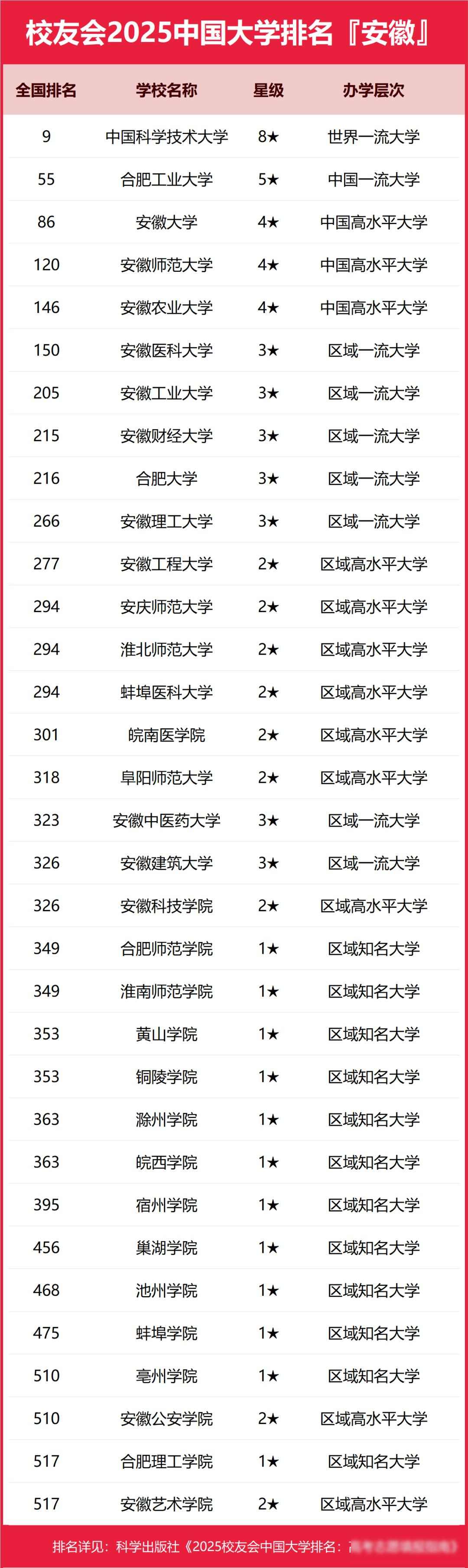安徽的大学排名今年又有了变化,中科大依然排在第一位,没有学校能超过它,合工大的位置也在往上走,工科实力变得更扎实,安大也进入高水平大学的队伍里,整体水平明显提升,最让人意外的是,以前排在前面的安财这次被安师大拉开了一大段距离。