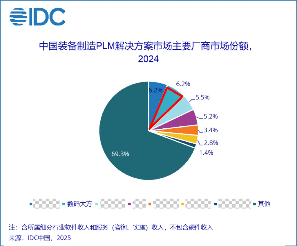 在IDC重点监测的细分行业中,数码大方表现卓越:在装备制造PLM解决方案市场,市场份额达6.2%,位列第一;在SaaS PLM子市场,以7.5%的份额位列第二。