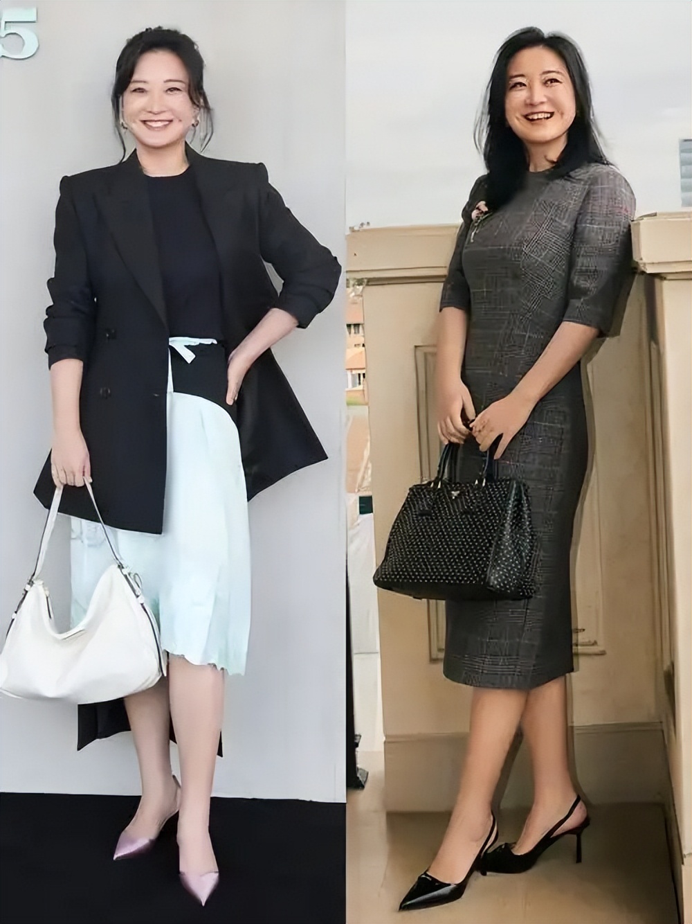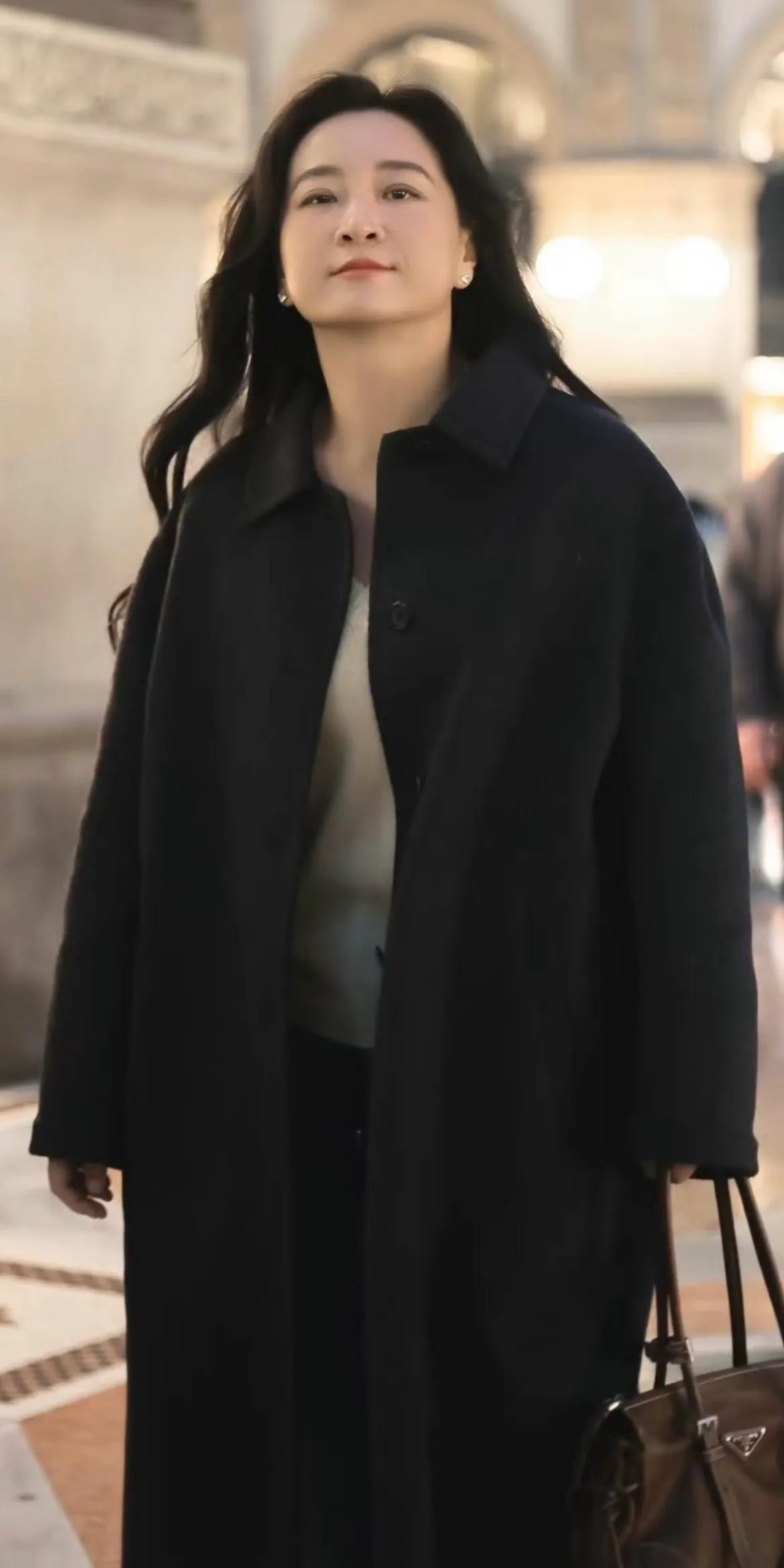 在米兰的街头,她身着宽松黑裙外搭驼色西装,大背头梳得一丝不苟,气场全开。