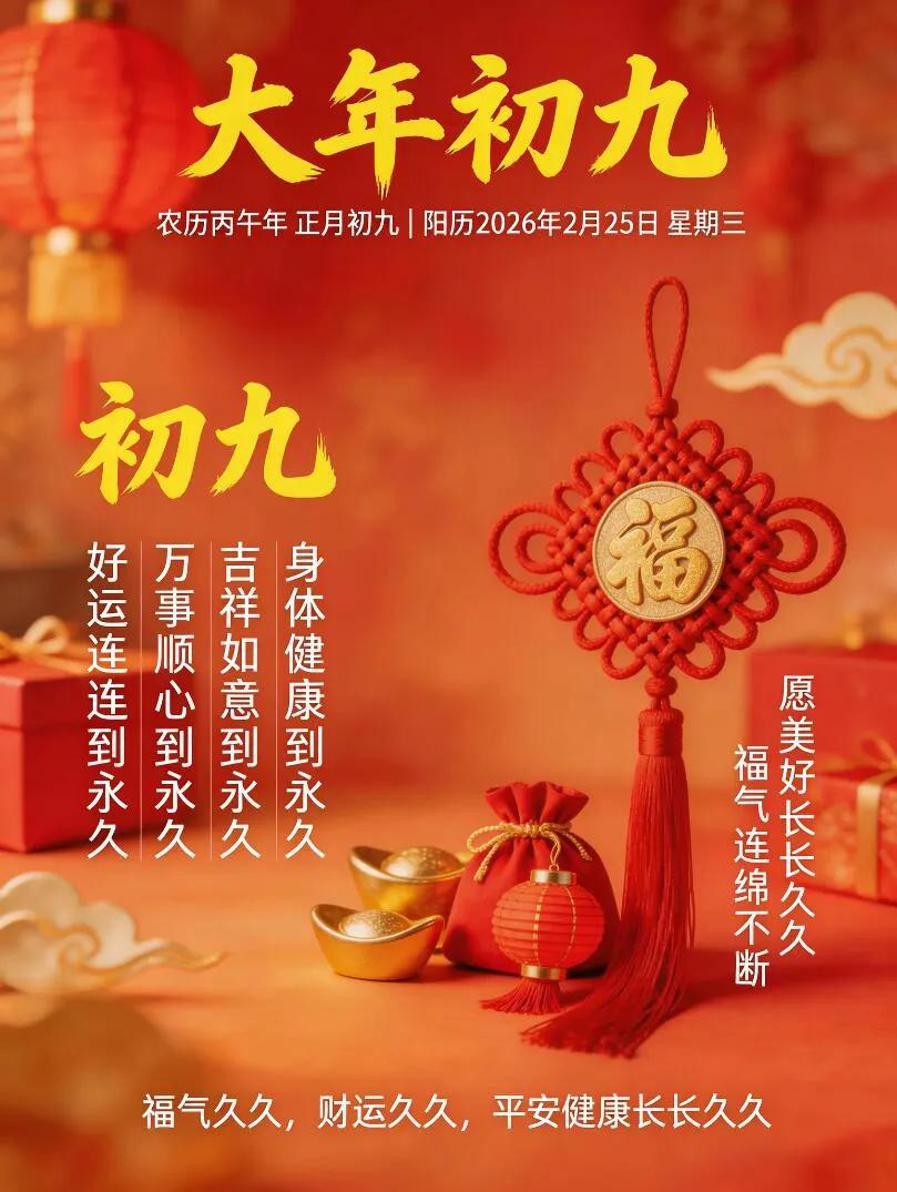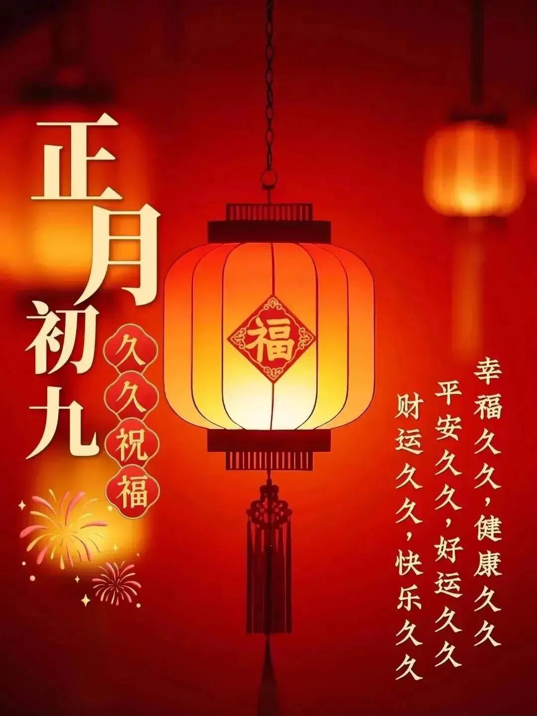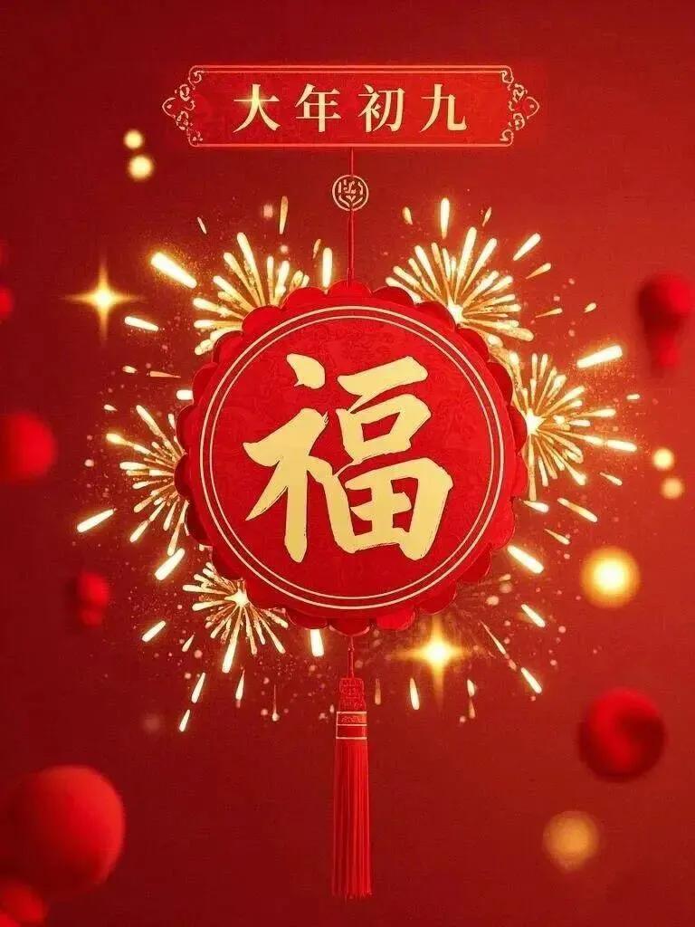 大年初九,九福临门一福身体健,二福心情爽,三福乐逍遥,四福好运随,五福财源广,六福无忧愁,七福青春驻,八福家庭和睦,九福