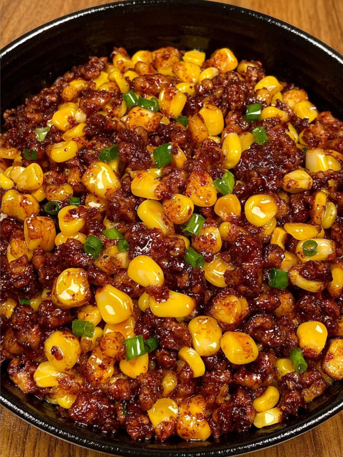 盛盘的时候,金黄色的玉米粒混着棕红色的肉末,撒上翠绿的葱花,看着就食欲大开。夹一筷子送进嘴里——玉米粒的脆甜,咬破薄脆的淀粉外壳,里面的汁水在嘴里爆开;肉末的酱香,嫩滑又带点嚼劲,孜然和辣椒的香味在舌尖打转,一点都不腻。拌米饭吃的时候,挖一大勺扣进碗里,拌匀后每粒米饭都裹着肉末和玉米,连吃三碗都觉得不够!