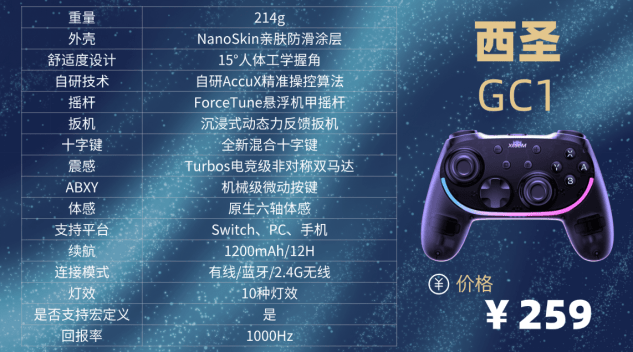 在连接与整体体验上,这款西圣电竞手柄同样堆满了高规格配置。它采用电竞级极速连接引擎,支持2.4G/蓝牙/Type-C三模连接,配合1000Hz回报率与智能抗干扰算法,延迟低至 0.5ms,在激烈对局中也能保持操作稳定、几乎无感延迟。原生六轴体感系统(陀螺仪+加速度计)实现1ms级响应和1:1动作映射,赛车漂移、射击瞄准都能做到更稳、更准。手感部分采用214g轻量化机身、15°科学握角与NanoSkin亲肤防滑涂层,长时间握持也不累手。兼容性方面覆盖手机、PC、Switch等主流平台,三模切换流畅,不挑设备。外观上运用半透明幻雾晶透外壳与RGB光效,10种灯效模式带来更强的沉浸氛围,整体质感与观感完全达到旗舰级水准。