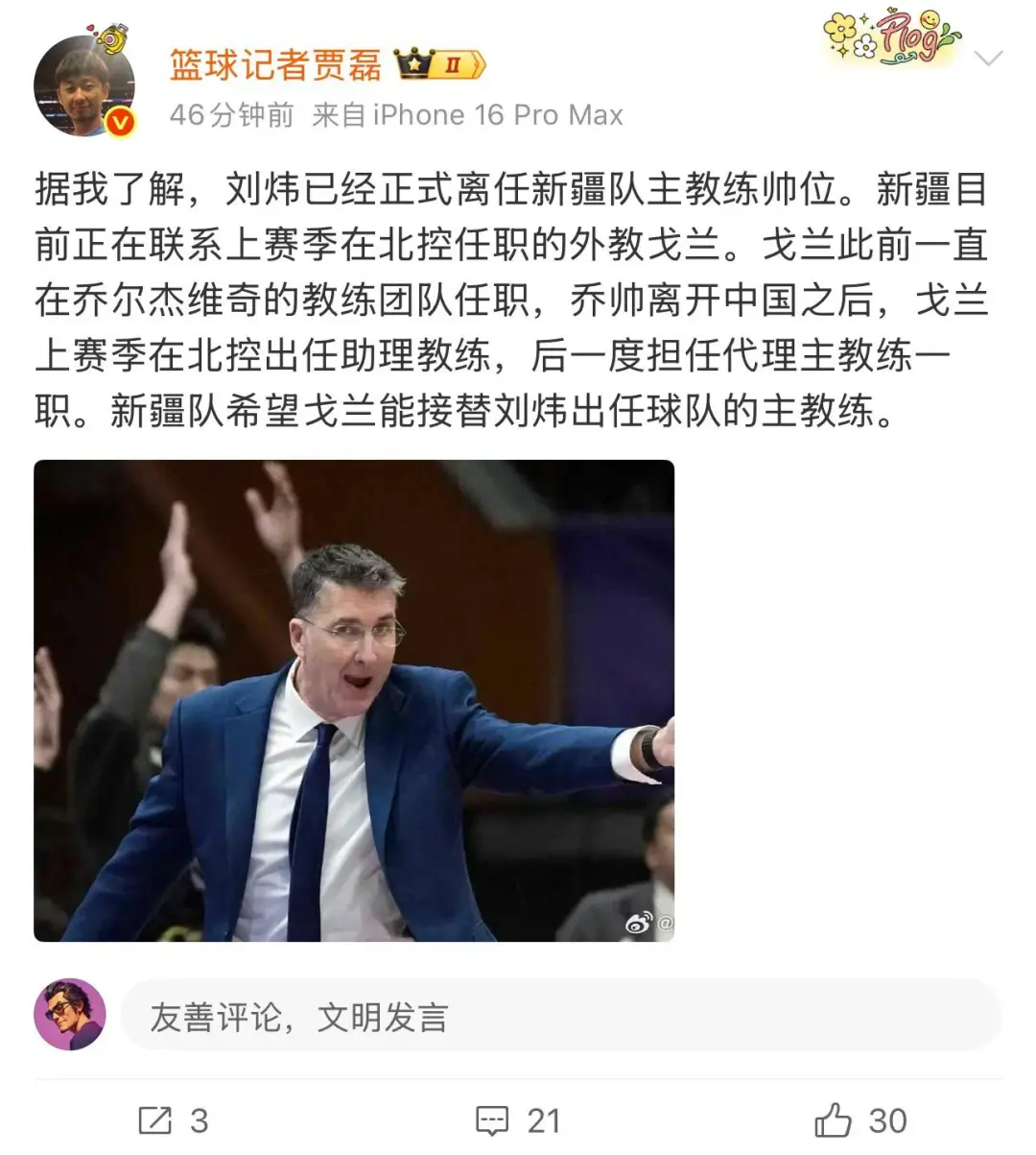 据多位媒体人透露,新疆男篮邀请欧洲名帅戈兰出任主教练,目前双方还在谈判。戈兰是前中国男篮主教练乔尔杰维奇的助理教练,上赛季在北控男篮担任助教,后面顶替闵鹿蕾成为北控代理主教练,季后赛带领北控以下克上淘汰山东男篮挺进八强,八强赛虽然输给了北京男篮,但是球队的韧性和精神面貌焕然一新。如果新疆能够邀请到戈兰担任主教练,那是一个不错的选择。