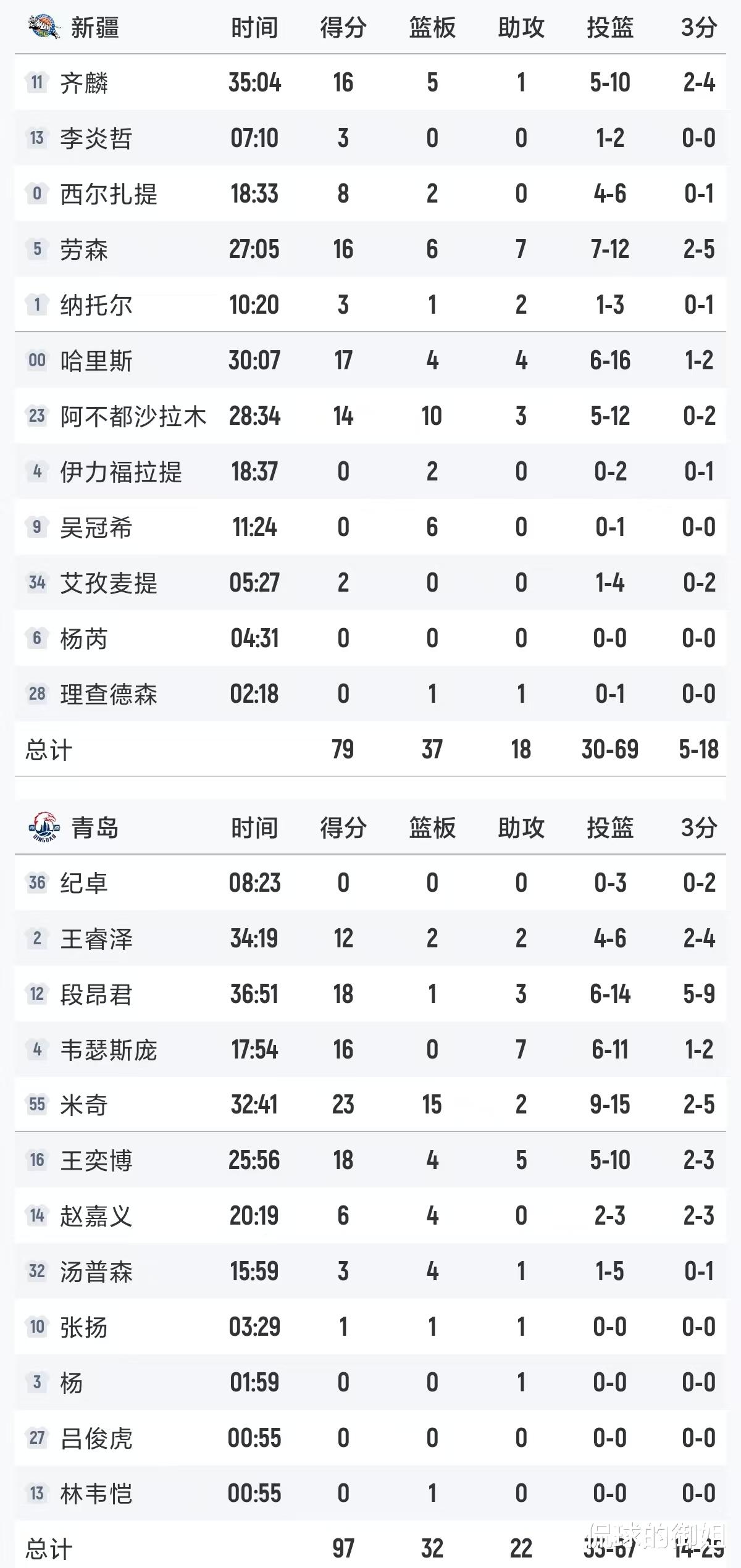 下半场回来,开局后两队进入对攻状态,沙拉木带队打出一波14-6小高潮,将比分缩小到7分打停青岛。比赛继续沙拉木带队继续追分,段昂君连得8分打停新疆,分差再次回到13分,三节战罢新疆仍落后10分。末节决战,王奕博三分投进拉开序幕,随着米奇三分投进打停新疆,分差回到15分还有半节时间,新疆主场甚至出现了喊刘炜主帅下课的呼声,最终新疆队79-97不敌青岛队。