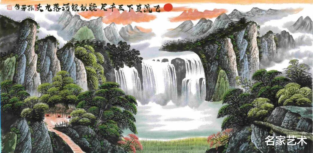 画中最醒目的,是东方天际那轮灼灼红日,霞光如锦,将层叠的山峦晕染出暖橙与绯红的渐变,恰应了“旭日东升”的题旨。红日之下,奇峰峻岭以水墨勾勒筋骨,赭石、花青敷色添韵,山石的刚劲与云雾的柔曼相映成趣——缭绕的云气似流泉般在山谷间游走,将山峰衬得宛若仙阙,而飞泻的瀑布自崖间奔涌而下,白练似的水势撞碎在青石上,又化作潺潺溪流绕桥而过,动静之间,让整幅画有了“活”的气韵。亭台民居隐于繁花绿树间,更添了人间烟火的温情,使得雄奇的山水多了份可居可游的亲切感。