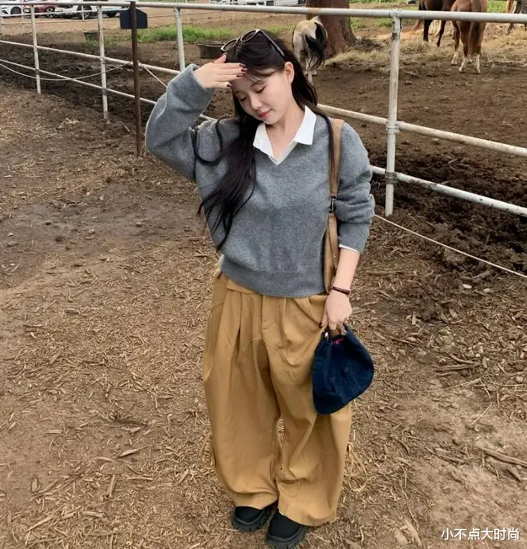 灰色V领针织叠穿白色衬衫,书卷气的知识分子气质,下身混搭复古宽松的浅棕色山系阔腿裤,一整套文艺又miu系的气质。上短下长,显高显瘦,简约松弛感。▼