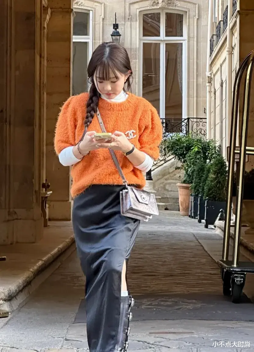 橙色系的短款针织衫提亮显白又有活力,微微宽松包容身材,随性又舒服。下身就搭配视觉收紧的深色高腰直筒裙,上松下紧,显高显瘦又时髦耐看。一整套元气显气质,又有休闲感,满满的韩系松弛感。▼