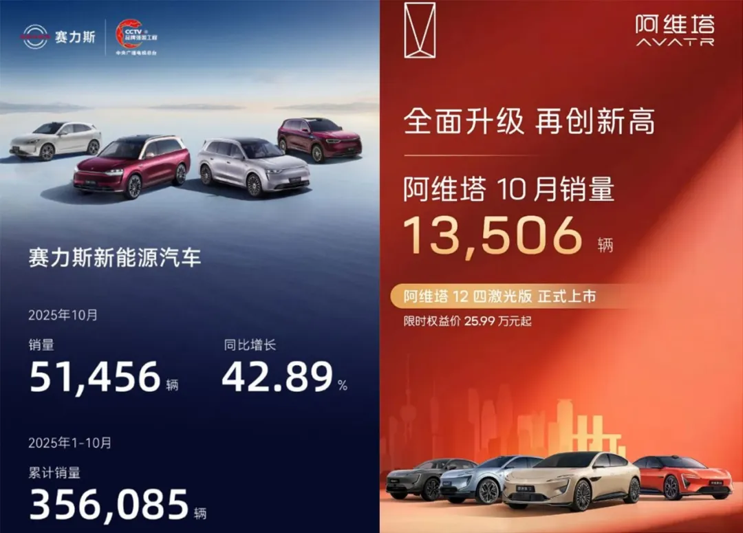 先来看问界、阿维塔等深度绑定华为与宁德时代的品牌。10月,问界单月销量5.1万辆,同比增长42.89%;阿维塔单月销量1.4万辆,同比增长34%。